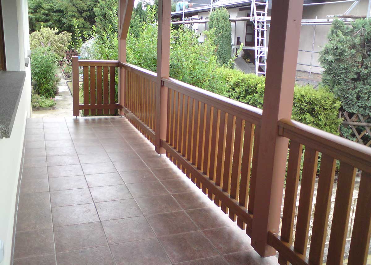 Die Konstruktion zeigt sich solide, aber nicht massiv. Schlanke, vertikal verlaufende Elemente geben dem Geländer seine klassische Linienführung. Von außen betrachtet wirkt es wie ein frisch gestrichenes Holzgeländer – von innen bietet es einen geschützten Raum, der auch bei schlechtem Wetter nutzbar bleibt.