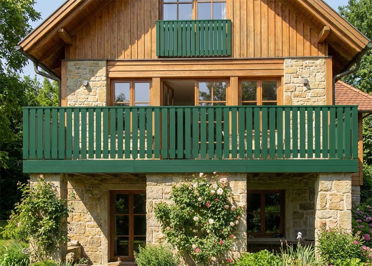 Das moosgrüne Geländer ist schlicht, aber nicht langweilig. Die senkrechte Lattung aus Kunststoffbretter sorgt für eine ruhige, gleichmäßige Fläche, die farblich mit dem Garten und den Holzdetails korrespondiert – so wirkt der Balkon wie ein organischer Teil des Hauses, nicht wie ein Fremdkörper.