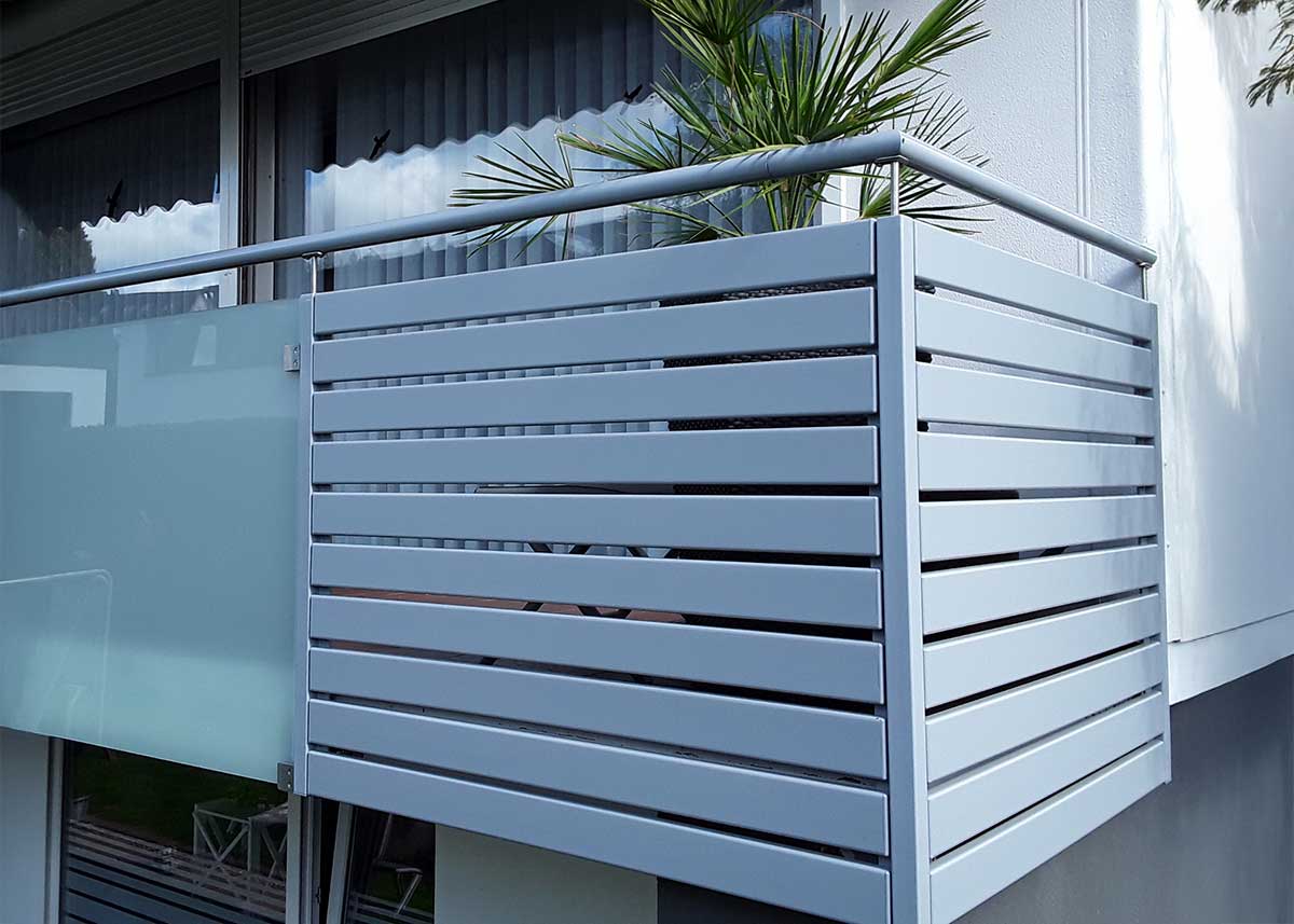 Was dieses Geländer auszeichnet, ist seine schmale horizontale Lattung: Die Kunststoffbretter laufen seitlich parallel und geben dem Balkon eine definierte, durchlaufende Fläche. Anders als breite Flächen oder verspielte Muster wirkt diese Anordnung ausgeglichen und proportioniert – gerade bei mittleren bis längeren Balkonfronten.