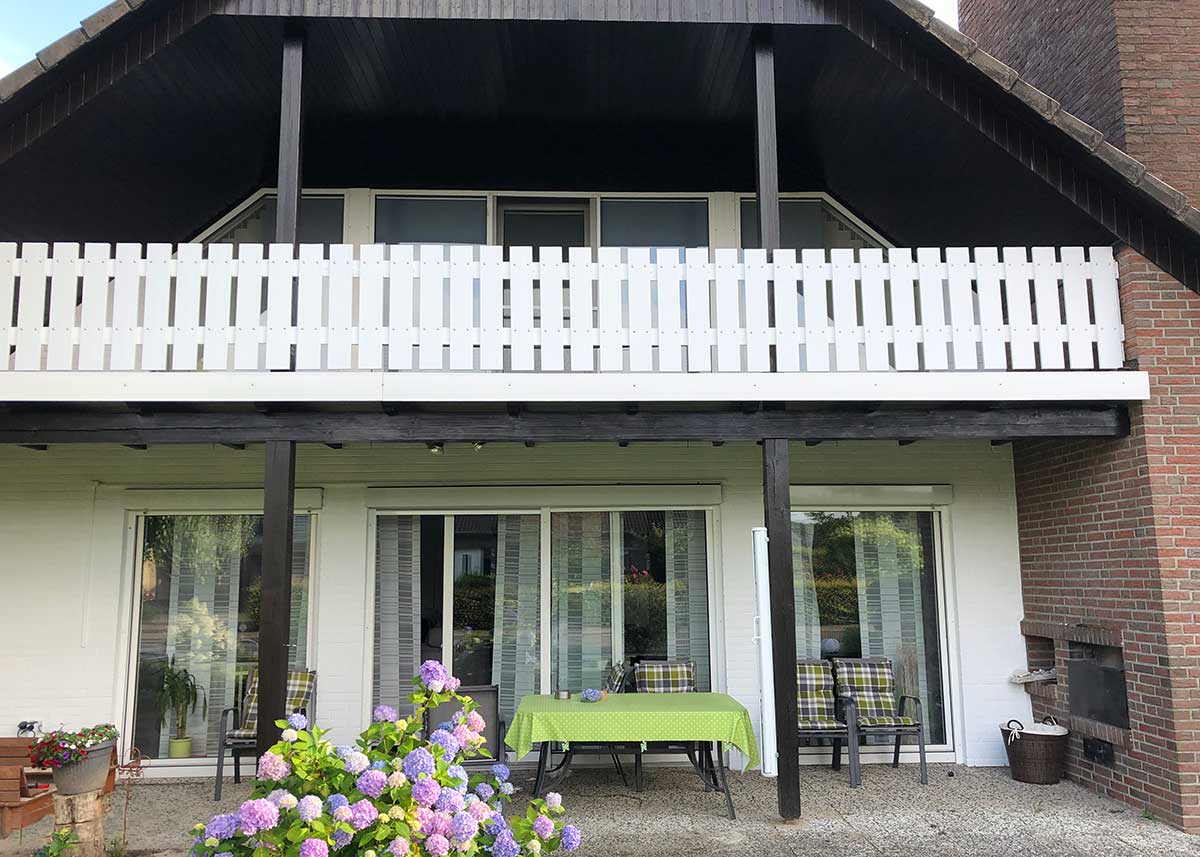 In Kombination mit dem dunkleren Dach und den Fensterrahmen entsteht ein ausgewogenes Bild. Die breiten Balkonlatten erzeugen eine Linie, die das Auge entlang des Hauses führt und für eine gelassene Wahrnehmung sorgt.