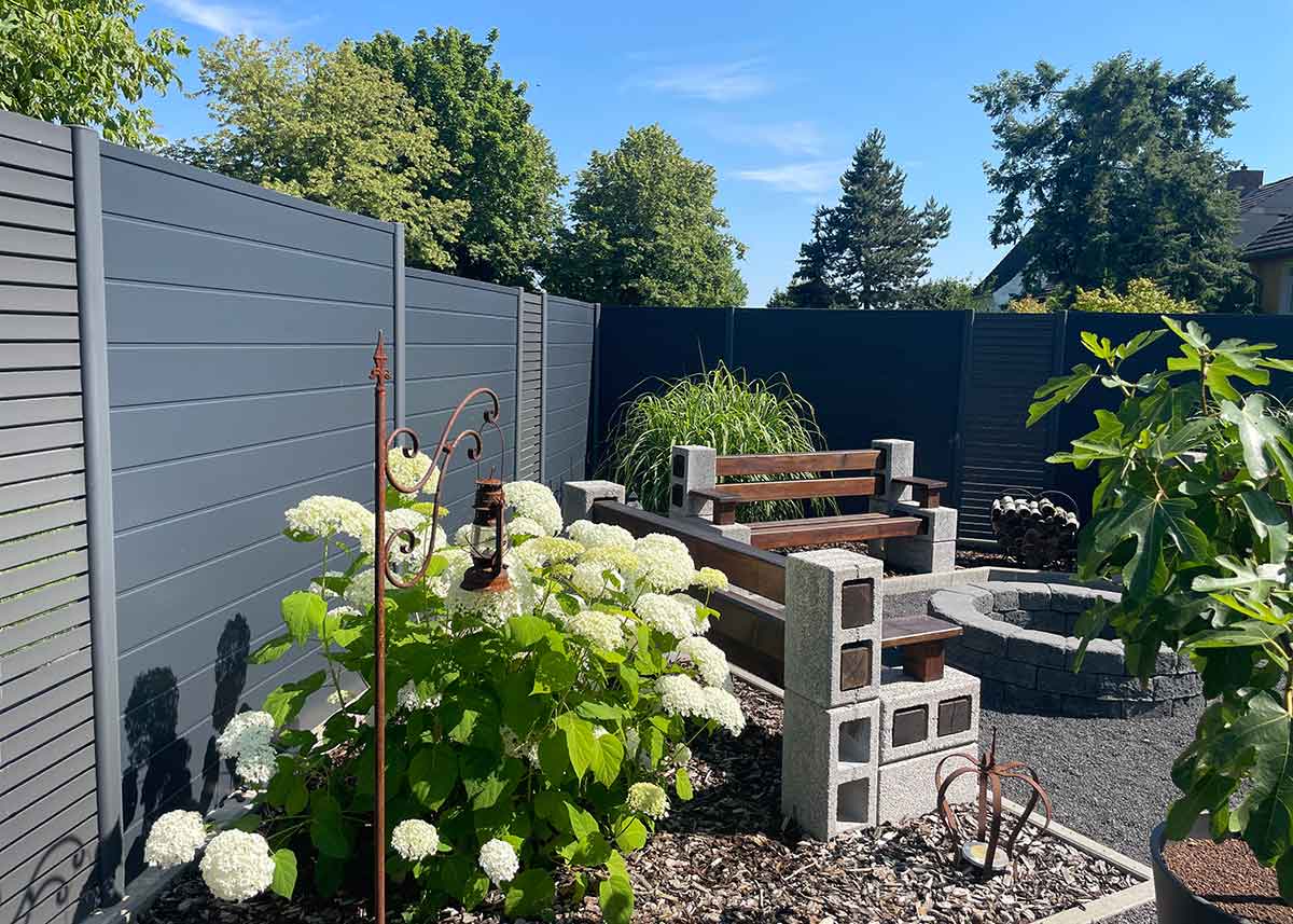 Dieser Sichtschutz in Anthrazit zeigt, wie gut sich ein Stecksystem mit moderner Gartengestaltung verbinden lässt. Aluminium Steckpfosten, Kunststoffpaneele und Zierelemente aus Aluminium mit Rhombusprofilen ergeben zusammen eine klare, hochwertige Lösung, die dem Garten Ruhe, Struktur und einen stimmigen Rahmen gibt.
